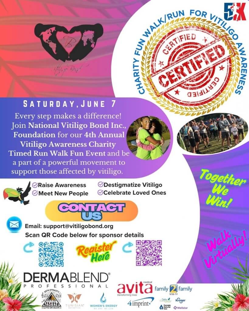 Every step we take brings us closer to greater understanding, connection, and support for the vitiligo community. We’re excited to announce the 4th Annual Vitiligo Awareness Charity Timed Run Walk Fun Event, hosted by National Vitiligo Bond Inc. Foundation — and we want YOU to be part of it!